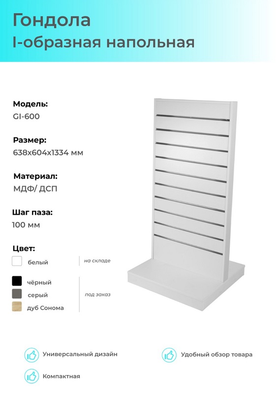 GI-600 Гондола I-образная напольная белая, 638*604*1325 мм, (МДФ/ ДСП), шаг паза100 мм