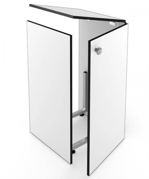 Благодаря прочному каркасу из металла устойчив и прочен. Выполнен из стойкого материала ЛДСП. Вверху прилавка — откидная дверь, спереди — распашная.