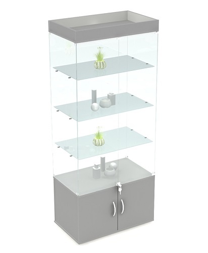 Витрина имеет 3 стеклянные полки, а также полку из ДСП.Снизу расположен накопитель,высота накопителя 500 мм.