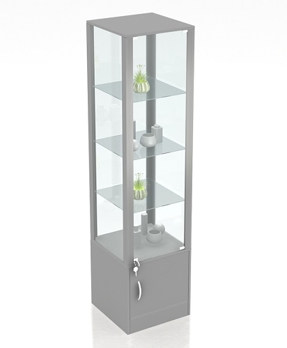 Витрина имеет 3 стеклянные полки, а также полку из ДСП.Снизу расположен накопитель,высота накопителя 500 мм.